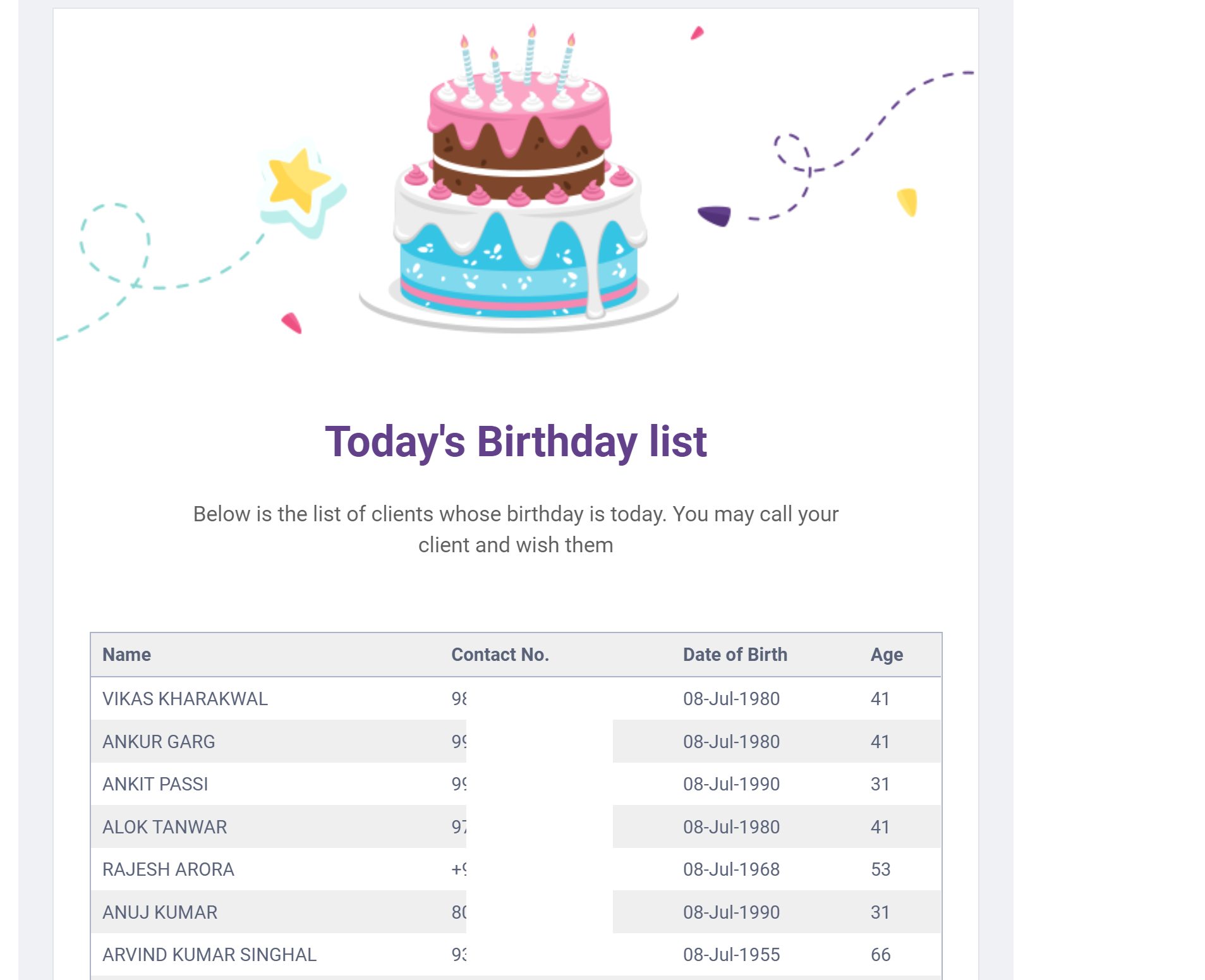 We have started sending a Daily mailer containing the Names and Contact no. of clients whose Birthday is today. This email that this mailer is sent to is picked from your Portal Settings.