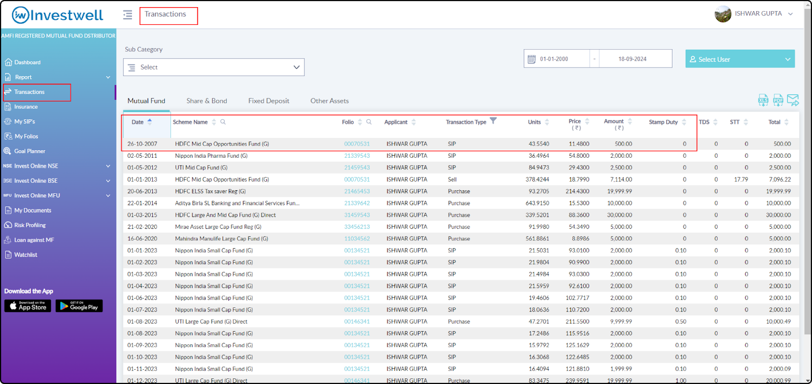 Dashboard > Investor Dashboard > Transactions > Use Filter