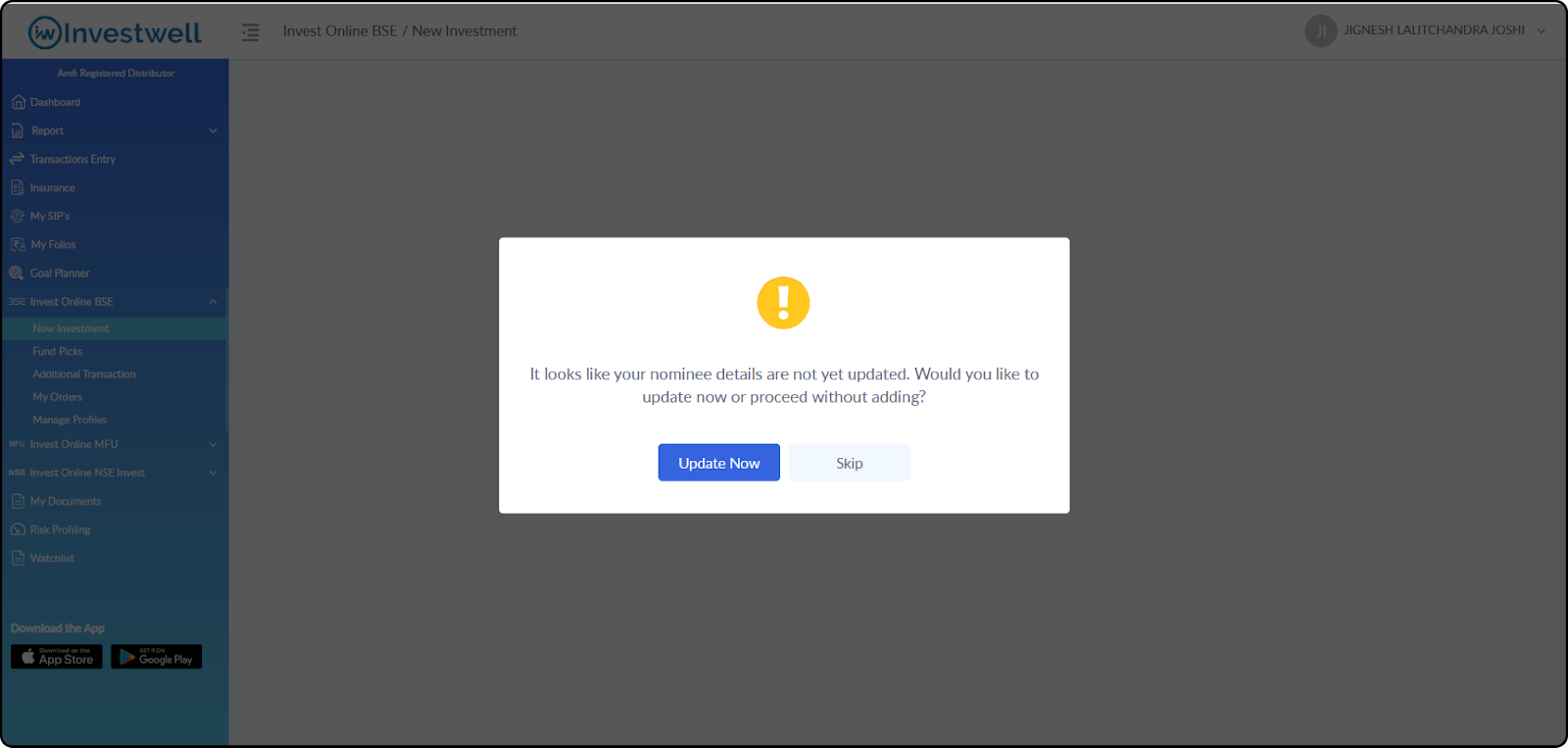 If the investor has opted "Yes" and any of the mandatory nominee details are missing, a prompt will ask the investor to Update Now /Skip