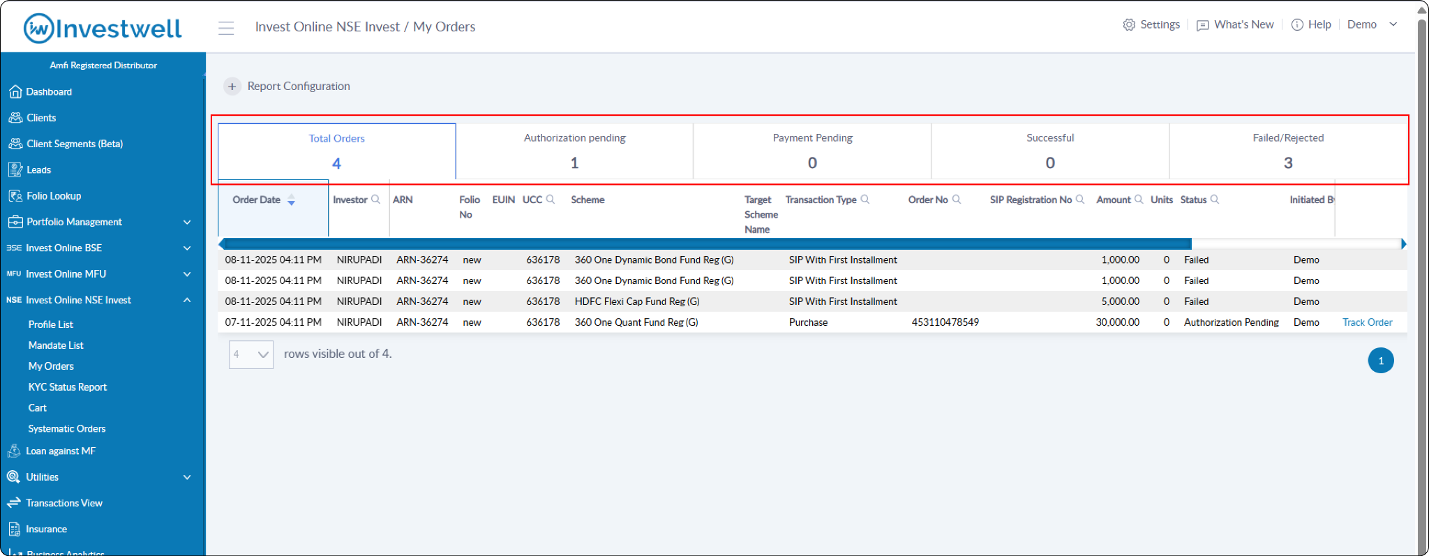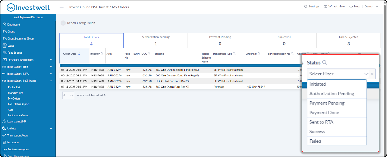 Additionally, we’ve refined the Status filter options. Earlier, only three filters, Initiated, Failed, and Success, were available. Now, the list includes more detailed statuses, and the Remarks column displays the exact messages received from NSE for better clarity.
