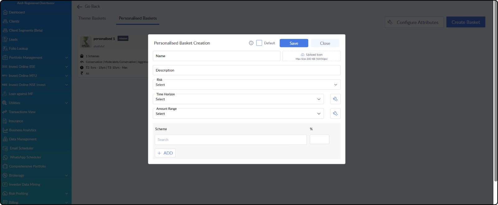 Broker Dashboard > Settings > Baskets > Personalised Basket