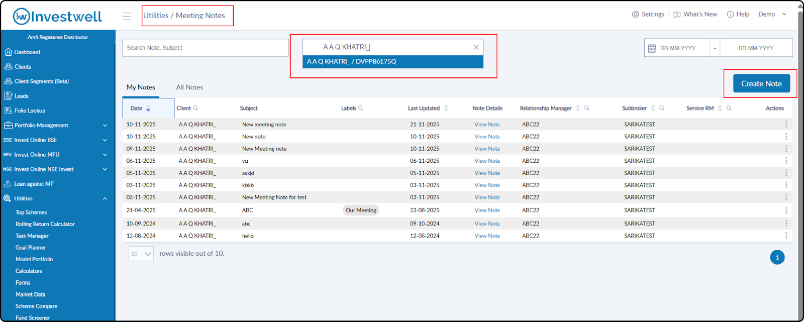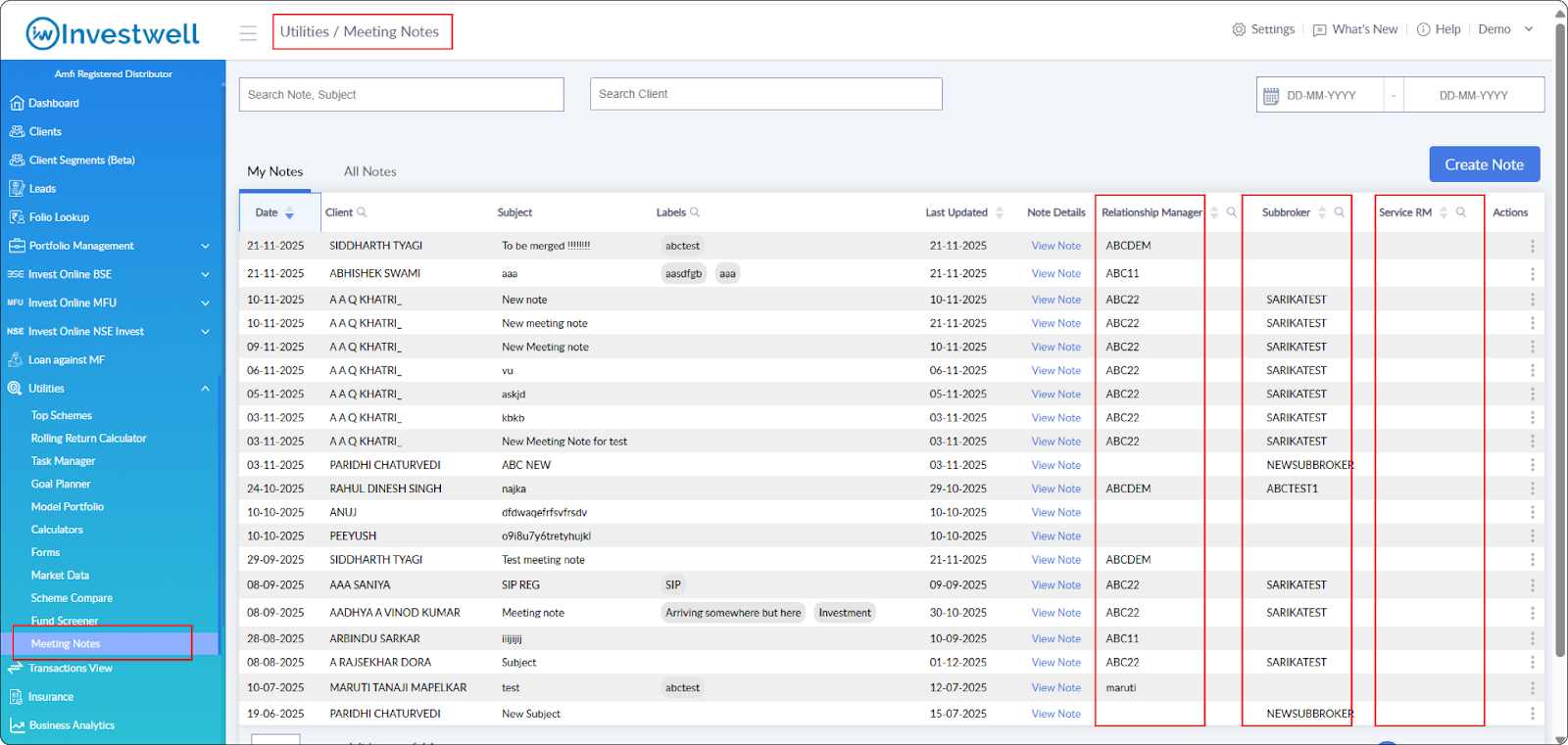 In the main Meeting Notes list, three new columns have been added: RM, Sub Broker, and Service RM. This gives you better visibility into who created each note or who is responsible for it.