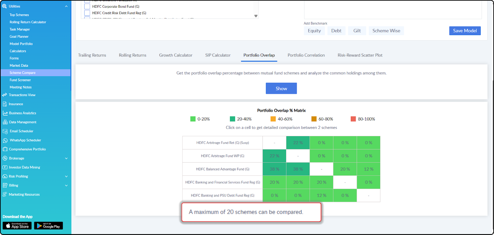 A simple but important improvement in Scheme Compare. The maximum number of schemes that you can compare in Portfolio Overlap has been increased from 10 to 20.