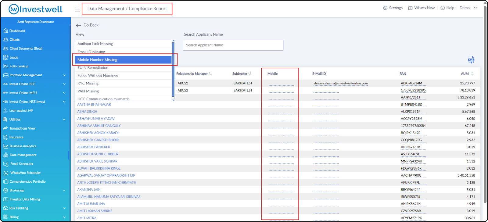 A new Report has been added to the Compliance Reports menu. You can now select Mobile Number Missing from the dropdown. The generated report will list all clients whose mobile numbers are not available.