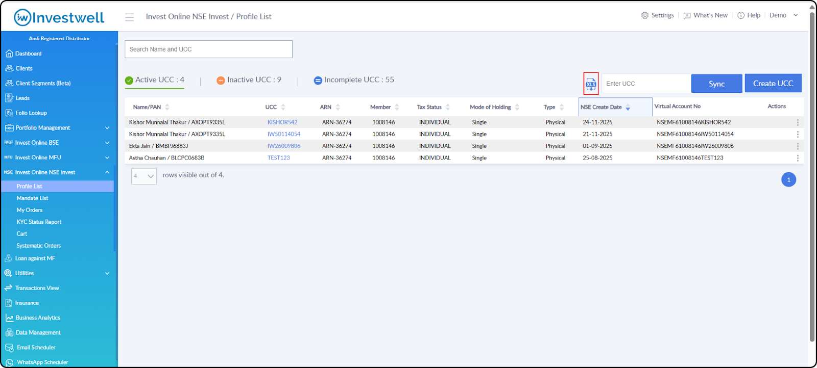Dashboard > Invest Online NSE Invest > Profile List > Create UCC
