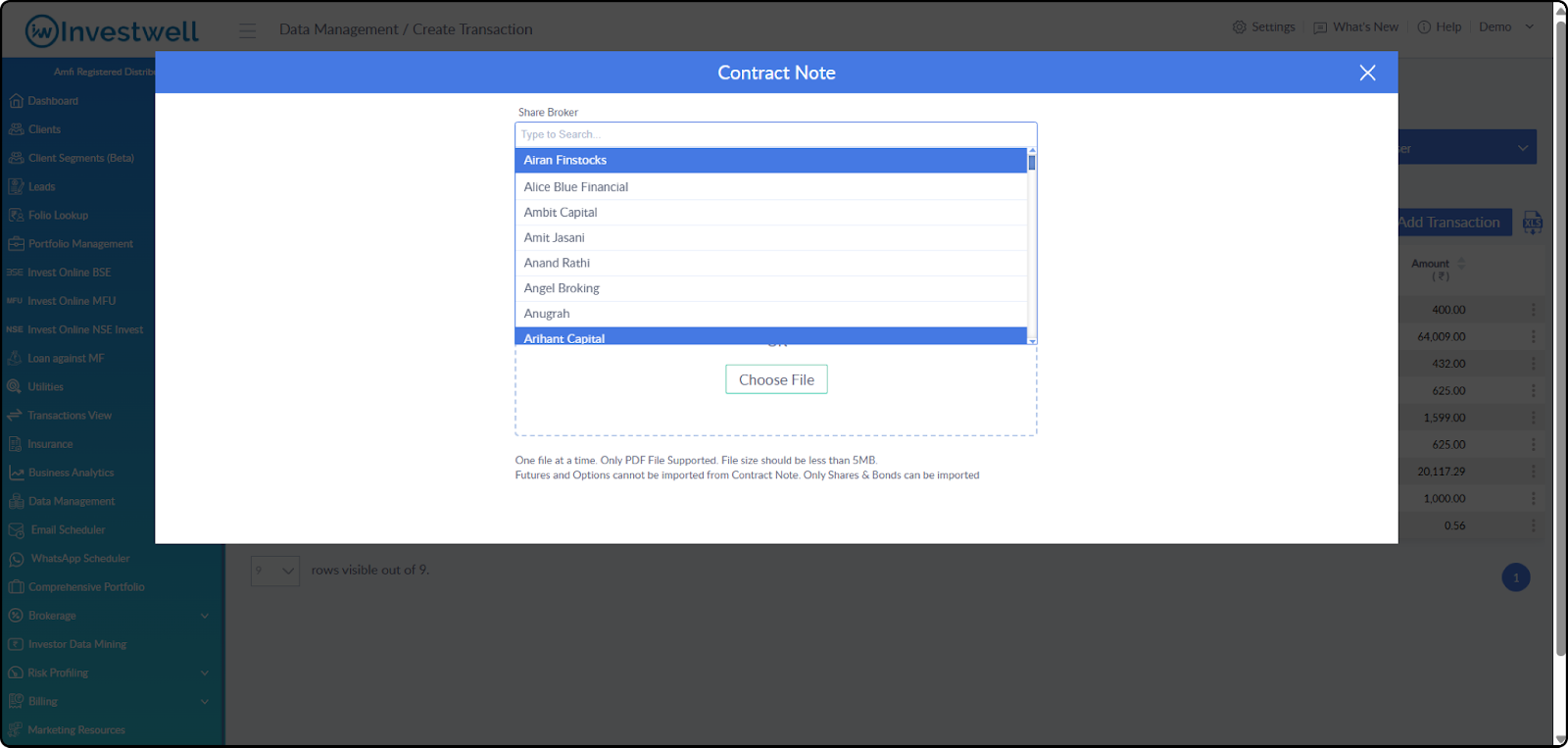Dashboard > Data Management > Create Transaction > Share & Bond( Contract Notes)