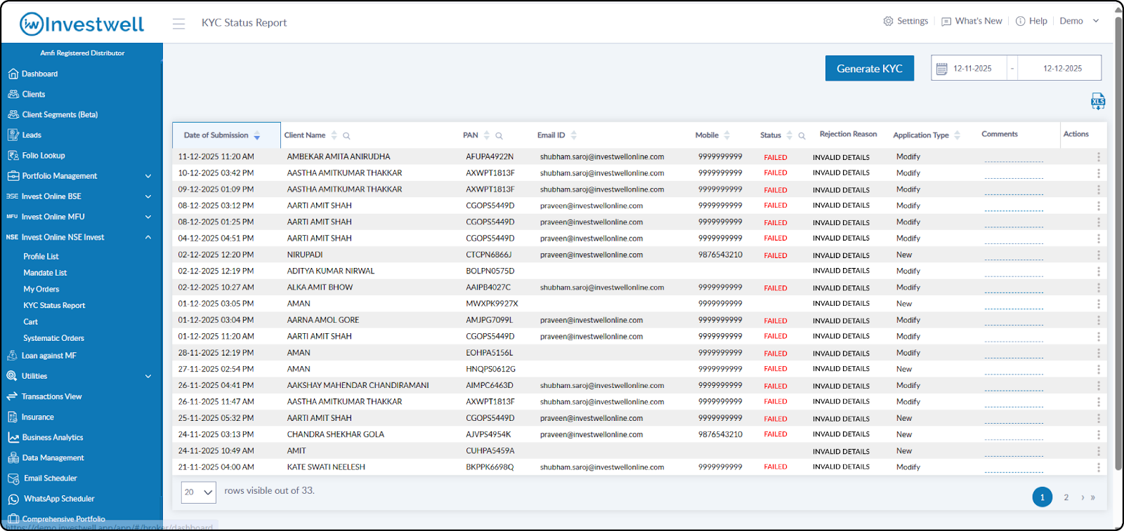 In the KYC Status Report menu, when a KYC application was rejected, the rejection reason did not appear in the report. Users were unable to view why the KYC failed.