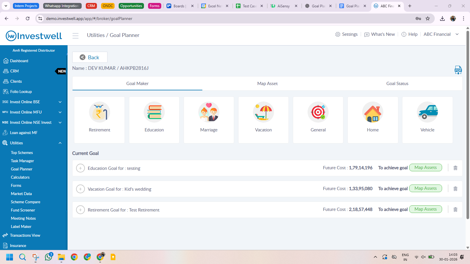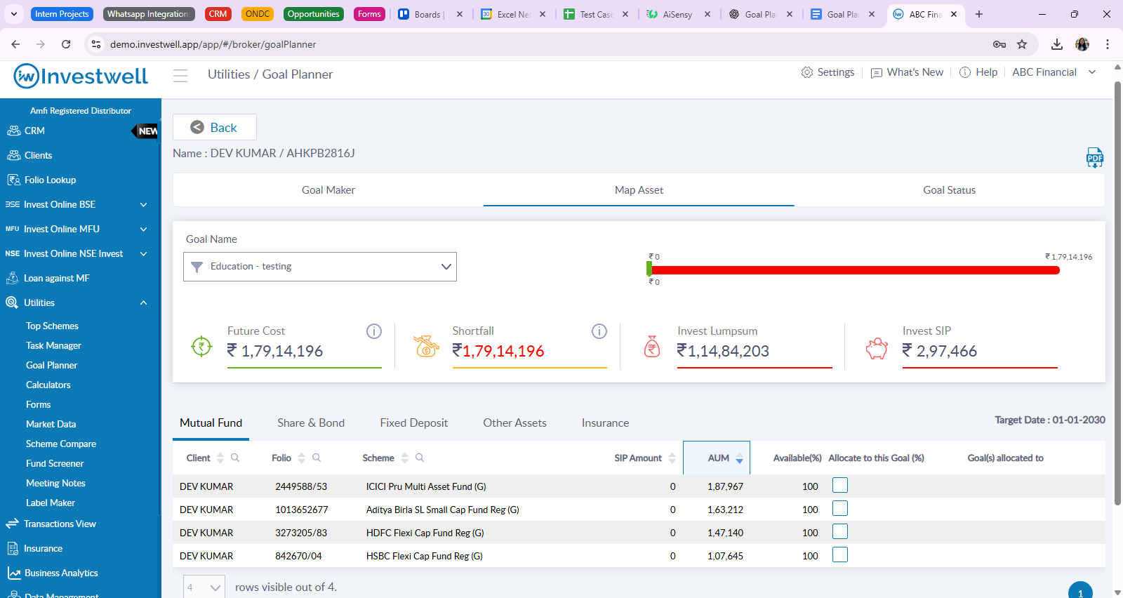 The Goal Planner module helps you define financial goals for your clients, map their existing investments to those goals, and track whether each goal is on track, in shortfall, or in surplus. It also allows you to generate a goal-wise PDF report that can be shared with clients during reviews.
